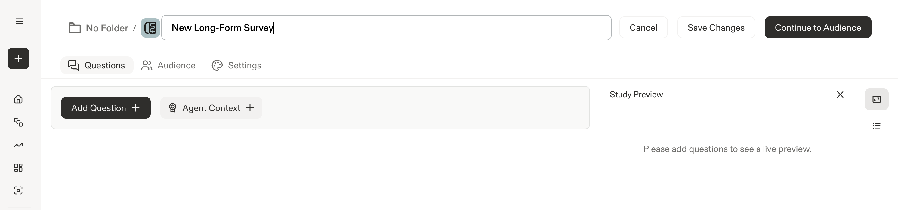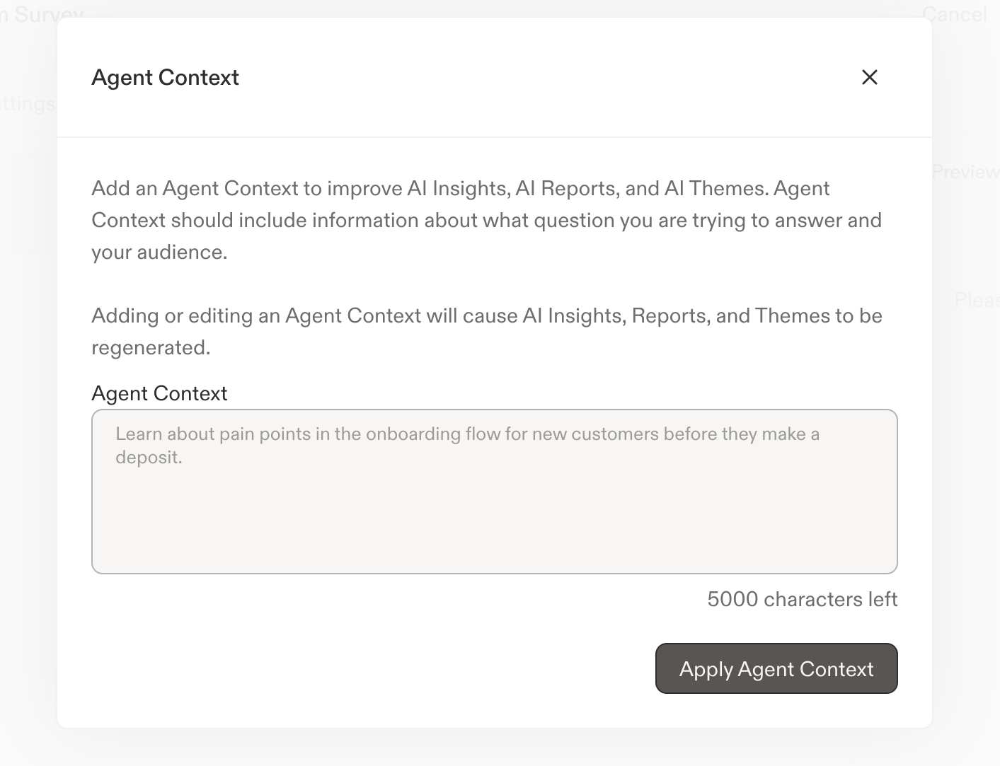 Adding an Agent Context significantly aids AI analysis by increasing priority of information that is most relevant to your current objective. Agent Context are used to inform response theme generation, response-to-theme analysis, and the summary of your study’s results.
