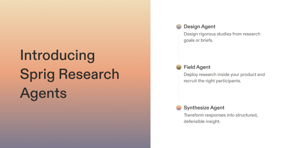 Sprig transforms manual survey workflows with a system powered by research agents, enabling enterprise teams to move from question to defensible insight without compromising rigor.