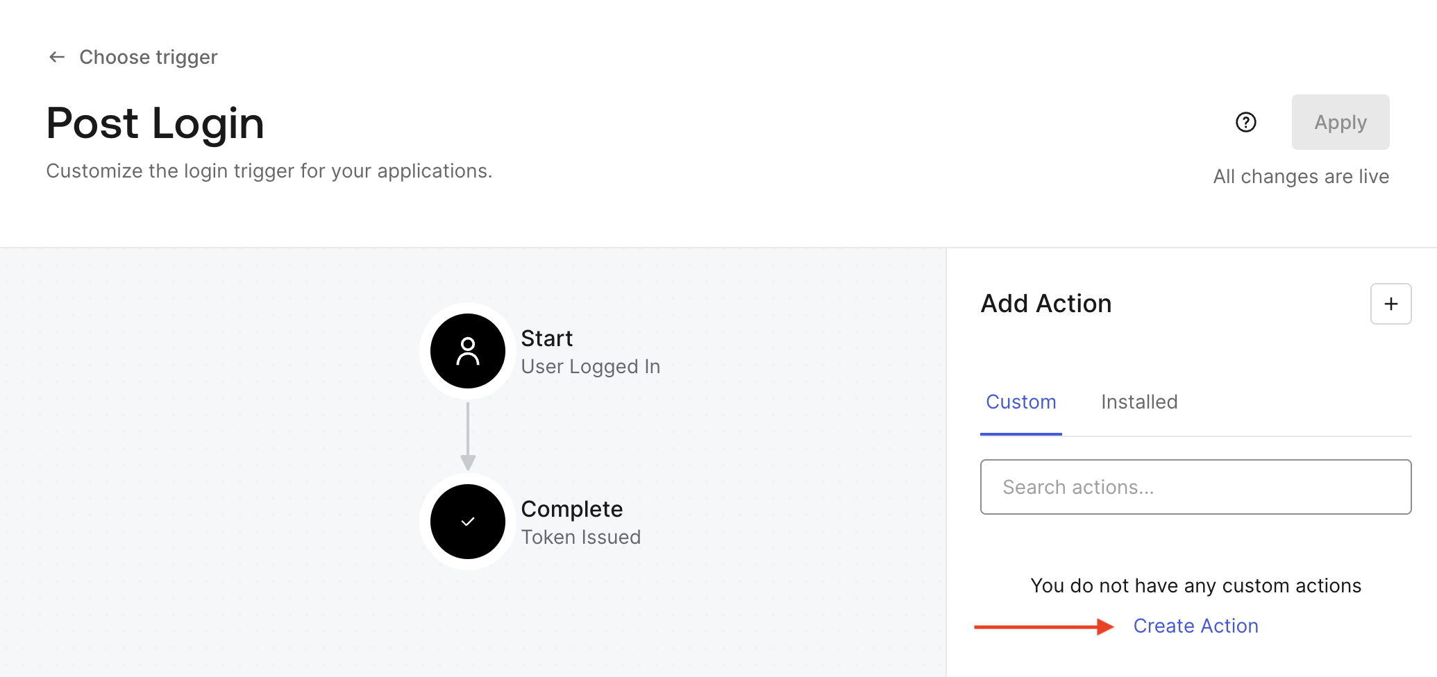 - In the left-hand sidebar, click on Actions > Triggers > post-login > Create Action.