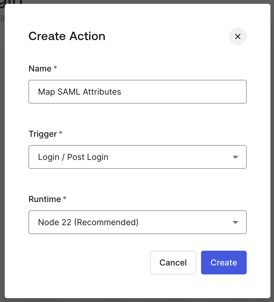 - In the "Name" field, enter "Map SAML Attributes" or whatever you would like the action to be called.
