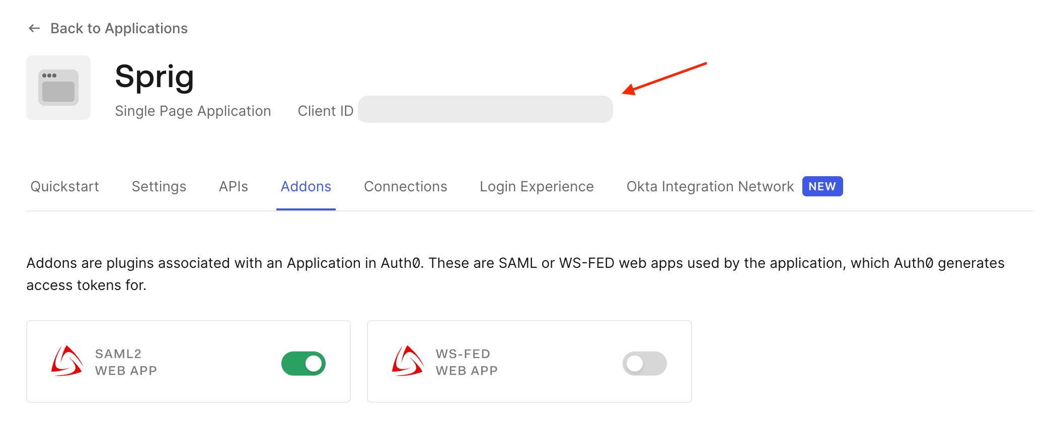 - Copy the ACS URL from the Sprig dashboard and paste it into the Application Callback URL field on the Settings tab in the Auth0 admin account.