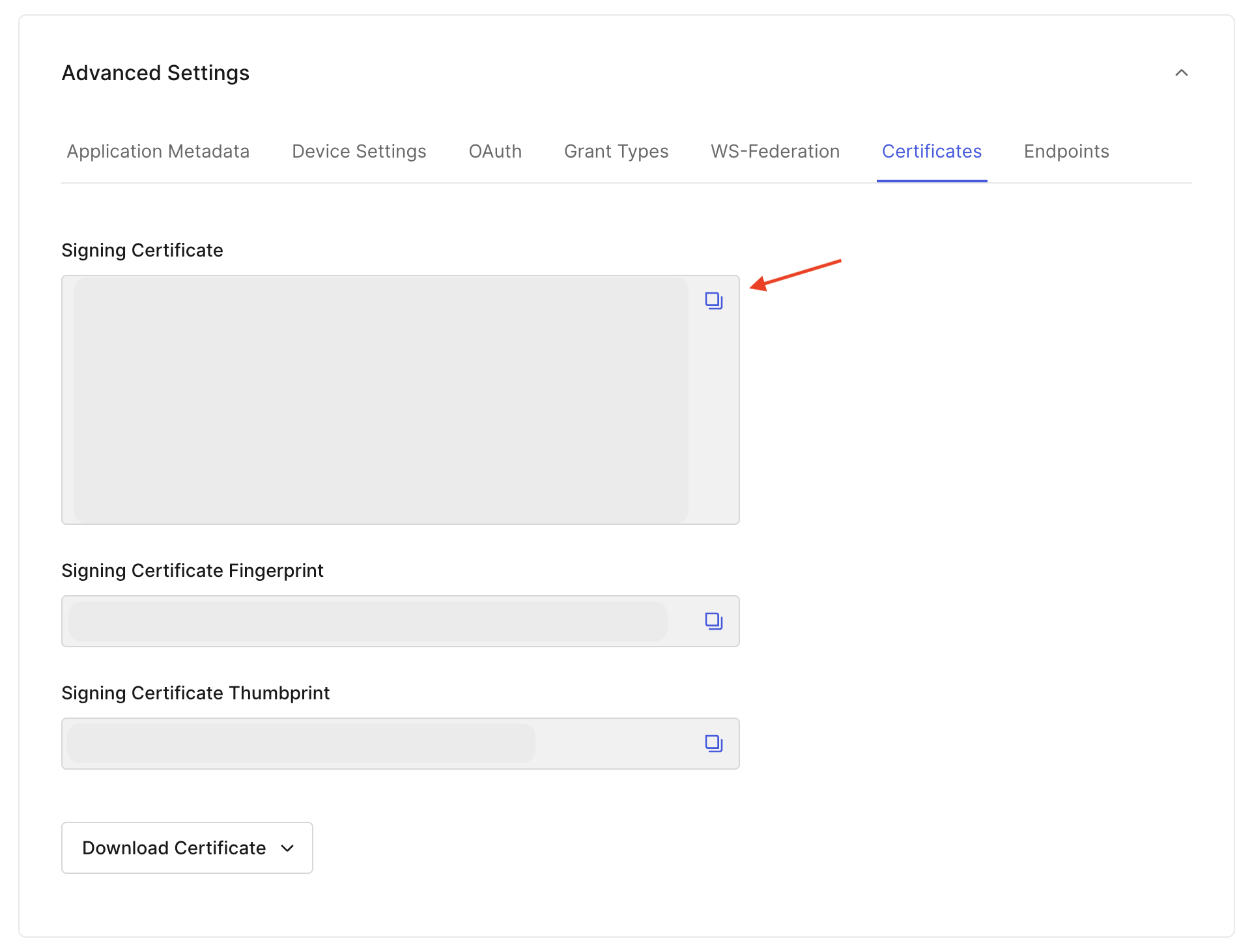 - Copy the contents of the Signing Certificate, paste it into the X.509 Certificate field in the Sprig dashboard, and click Save.