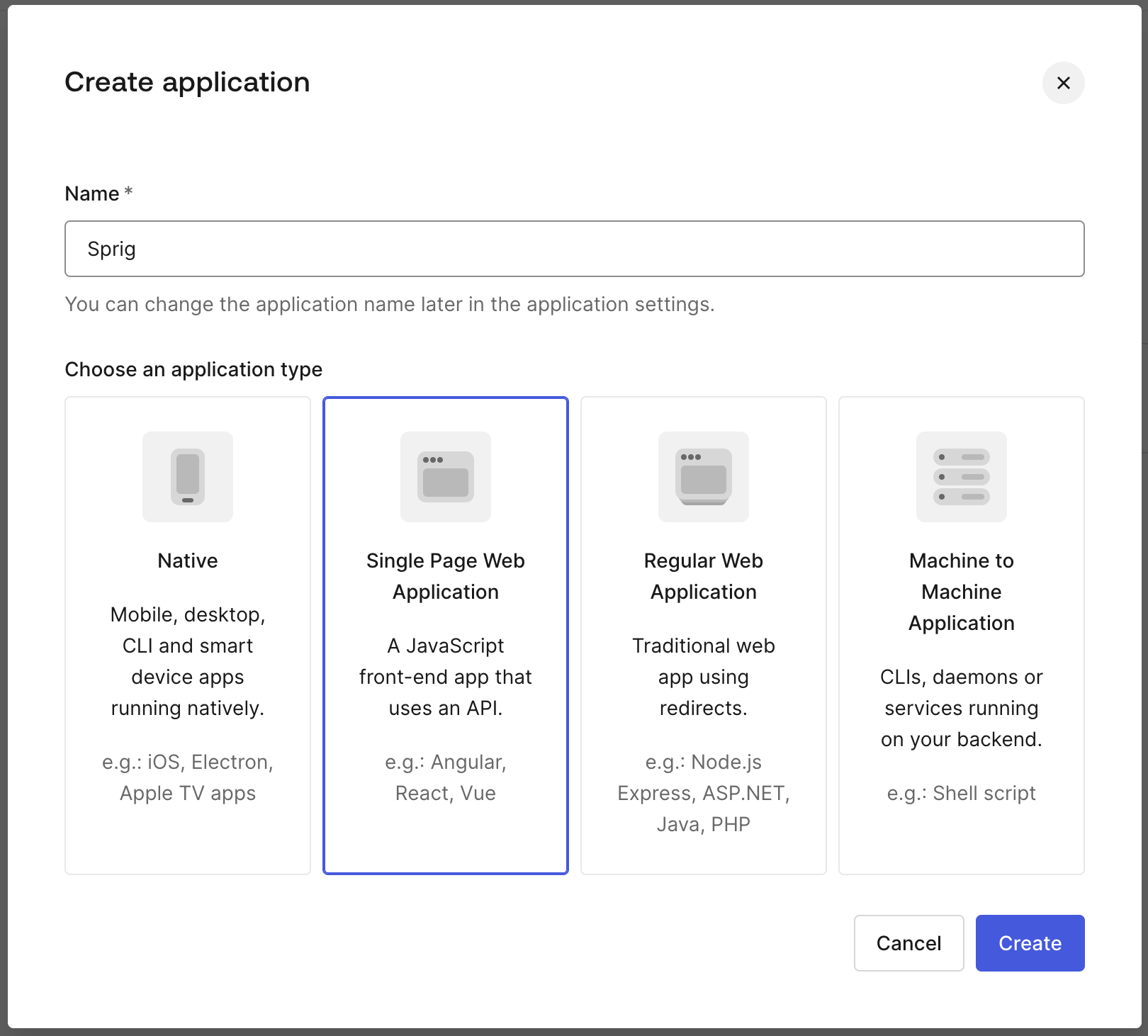 - In the "Name" field, enter "Sprig" or whatever you would like the application to be called, select "Single Page Web Application and click Create.