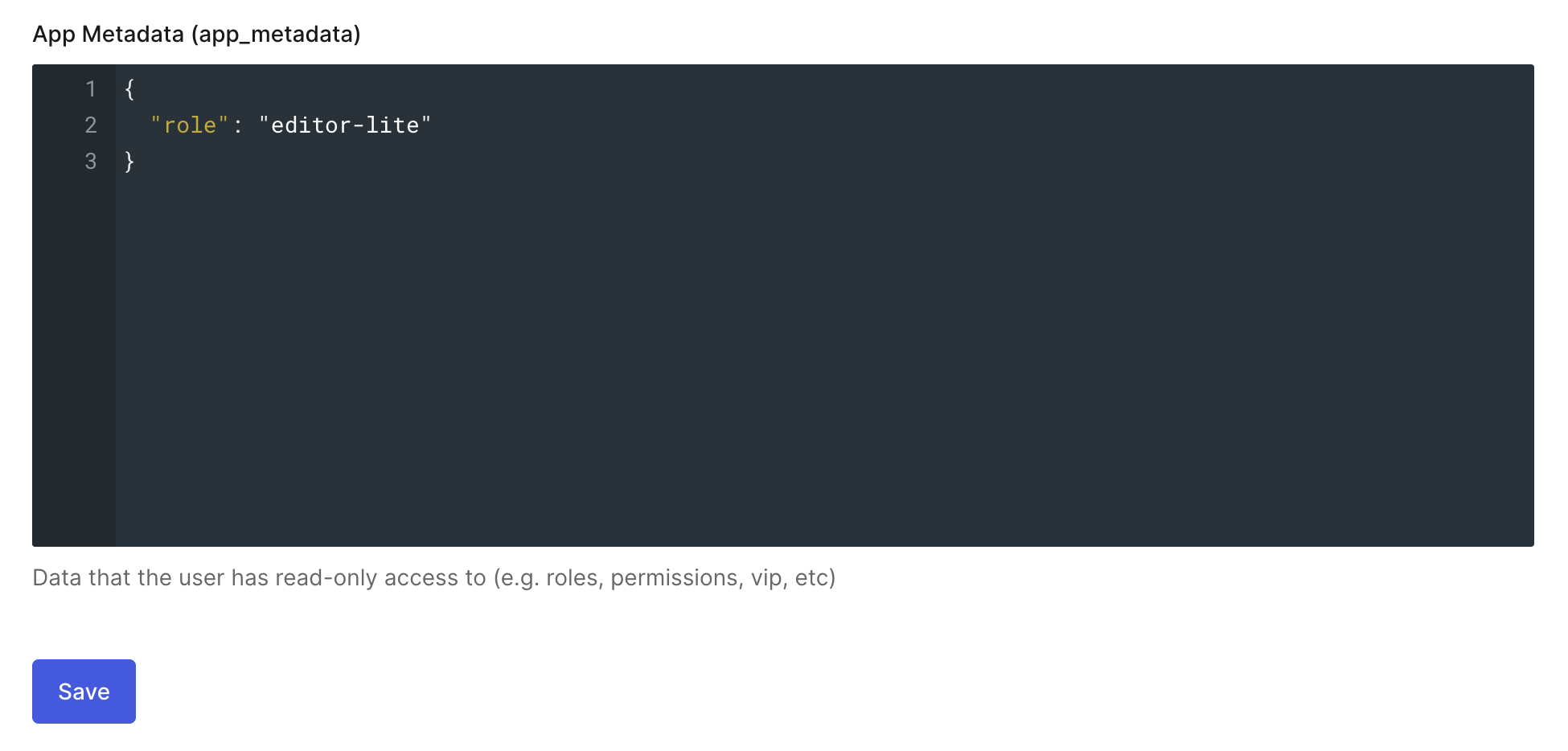 rolewill need to be added to the profile of users who will use SSO to login to Sprig. If a role is not added to a user, it will default toviewerwhen they login for the first time. The available roles areadmin,developer,editor,editor-lite, andviewer. For more information about the access permissions associated with each role, see our documentation on Member Permissions.- To add a role to a user, click on User Management > Users and click on a particular user. Under "App Metadata (app_metadata)," enter the role as follows: