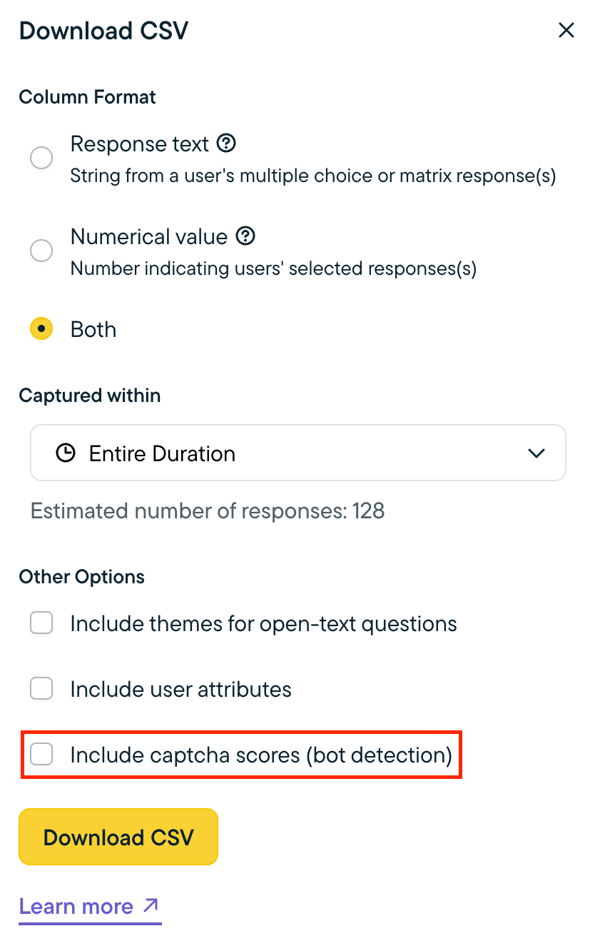 When exporting study data via CSV, suspected bot responses will be included, but you will have the option to include reCAPTCHA scores in the export. The score will be in a new column labeled “captchaScore.” Scores range from 0.0 to 1.0. The higher the score, the more likely that the response is from a human. Learn more by reviewing Google's interpreting reCAPTCHA scores page.