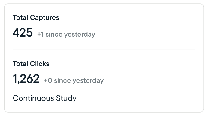 - The completion percentage (as applicable) shows how close you are to completing your study based on the target number of responses or captures you've set.