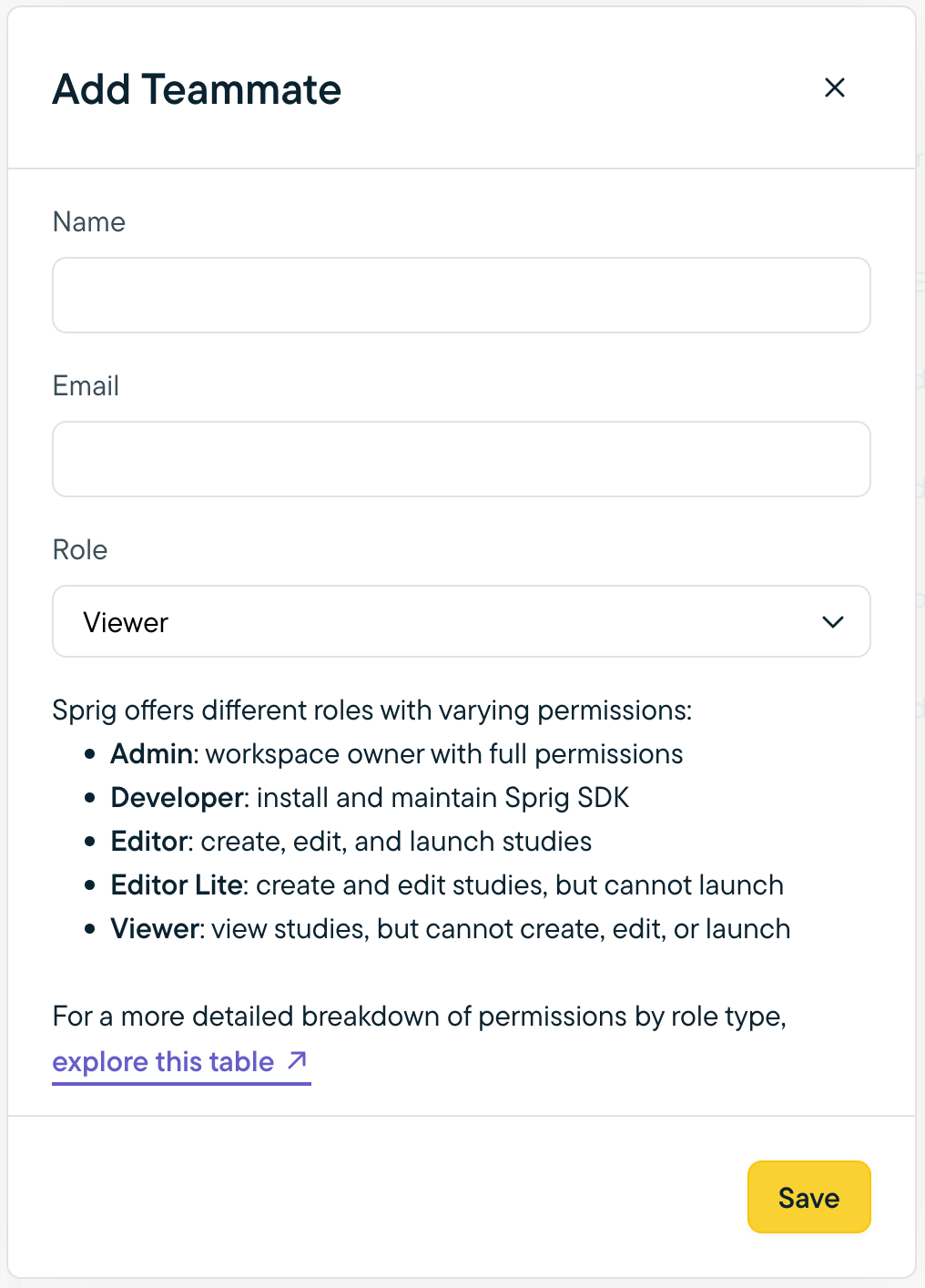 - In the modal that opens, enter the team member's name, email address, and the role you want them to have. Click Save.