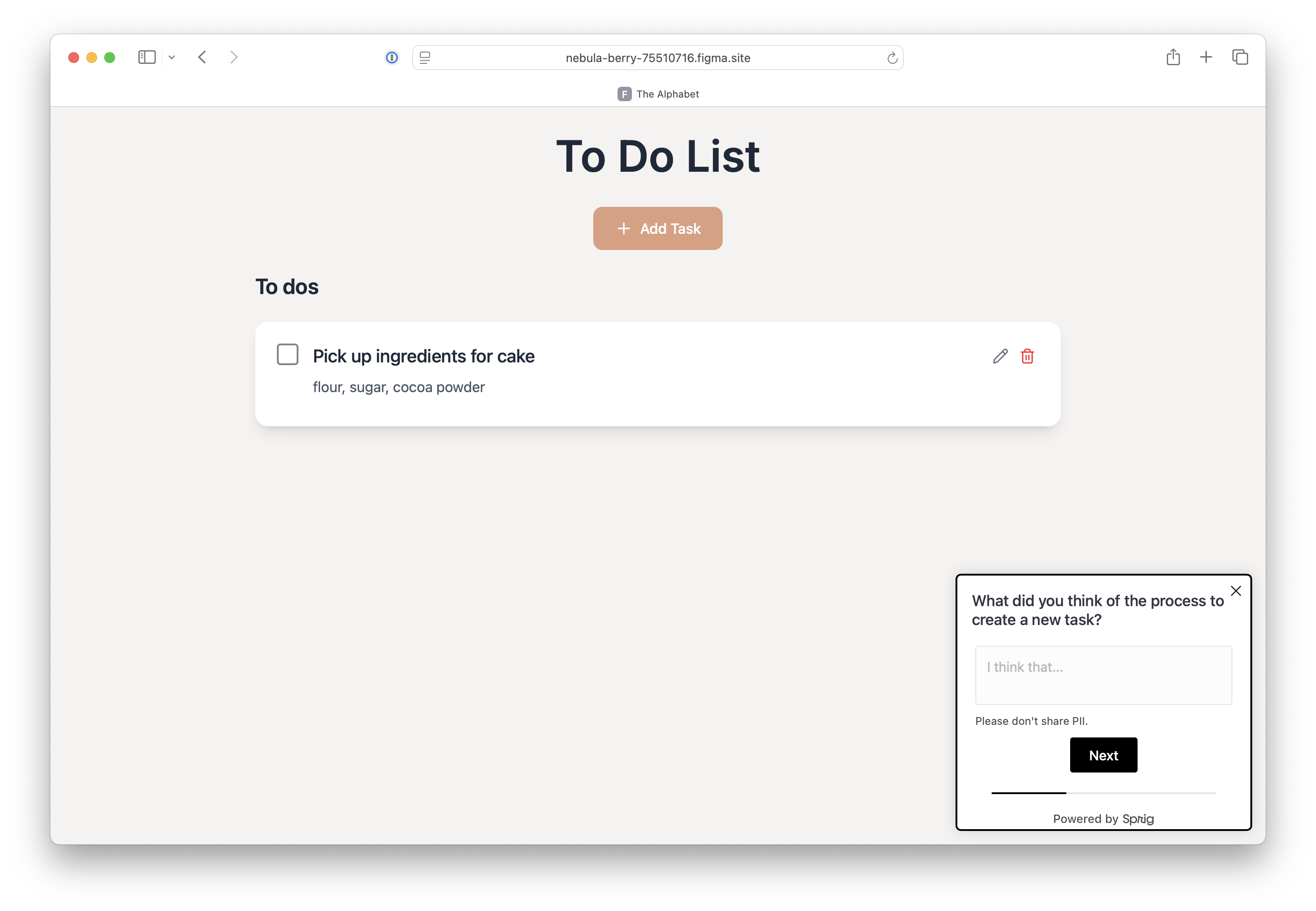 Once the Sprig SDK is installed, navigate to your Sprig instance, create a new In-Product survey or feedback study, build the questions, and set up Targeting criteria (you can use Events or URLs). It's as easy as that! You'll be able to see the survey in your prototype once it's published. As users explore the prototype and fill out the survey, response data will flow to Sprig as normal.